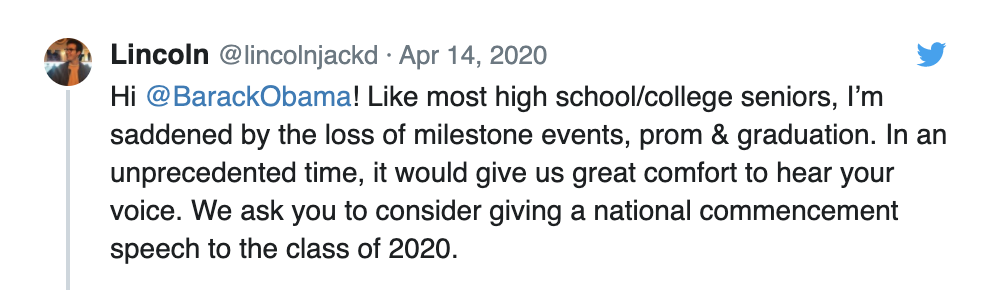 美国一名即将毕业的高中生林肯在社交媒体上写道:”奥巴马你好!像大多数高中/大学毕业生一样,我因为失去重要的活动、毕业舞会和毕业典礼而感到难过。在这样一个特殊的时刻,听到你的声音会给我们很大的安慰。我们希望你考虑给2020届毕业生做一次全国毕业典礼演讲。”这条帖子引发了全美毕业生的共鸣,获得了22.3万人点赞。