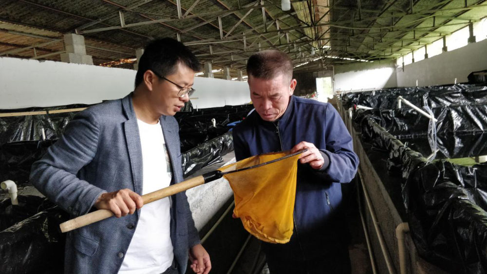 广西上林县西燕镇岜独村驻村第一书记康勇(左一)在龟鳖养殖场和养殖能人交流(4月24日摄)。新华社记者 农冠斌 摄