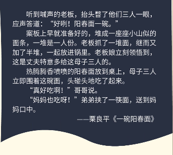 这节课写的是如何表达母亲的爱,在这个环节,选取了栗良平的《一碗阳春面》,让孩子体会其中所用的写作手法。