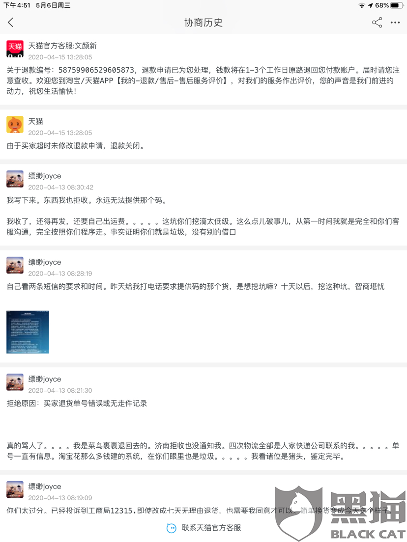 消费者“七碗生风1989”在5月6日向黑猫投诉平台再次反映:“期间,4-15天猫超市曾经发生短信和站内信,通知钱款原路退回。结果在接到对方售后服务部门一个电话以后,当日下午站内退款被关闭,至今未收到对方两方面发消息的退款。”
