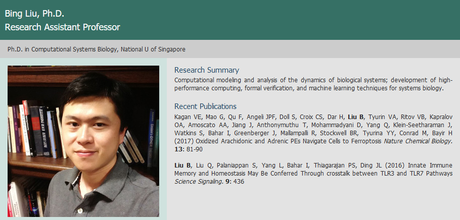 匹兹堡大学发布的一份声明中称,刘宾是匹兹堡大学医学中心(UPMC)计算与系统生物学系的一名助理研究员。声明中将他称为一名优秀的导师和高产的研究者,在该学院就职的六年间,他与人合著了一本书与30多篇论文,他还为一系列复杂的过程设计了许多定量模型,为实验人员和临床医生提供了重要的见解。