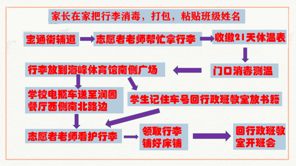 整个返校流程可概括为“快速返校入学九步走”:“一停二传三交表;四消五检六分道;七整八会九查找”。学生将按照流程安全、有序返校。