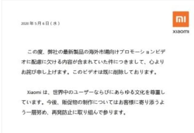 在事件扩大以后,小米也很快认识到这则广告的不妥。不但立刻将广告视频下架,同时也在推特上发表了道歉声明。小米表示:这则针对国际市场的产品促销广告,在内容制作上有欠考虑,小米已经删除了这则广告,同时小米未来制作视频会基于对世界各国文化的尊重,严防此类事情再次发生。