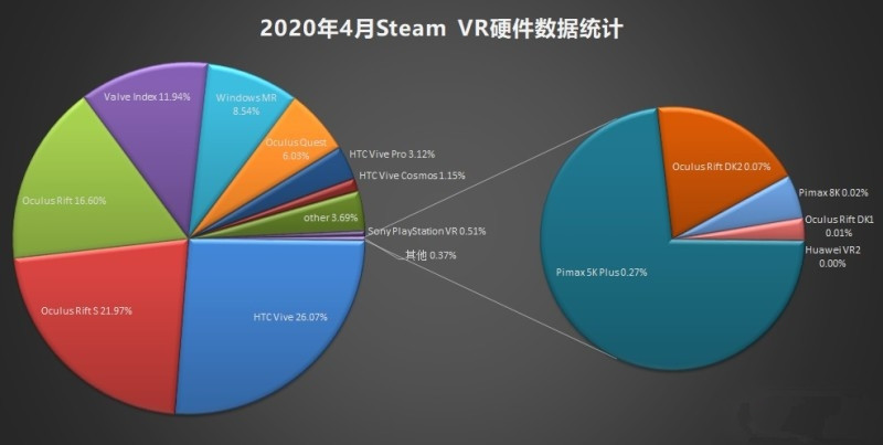 而根据4月份SteamVR头显硬件统计数据,从高到低排名为: