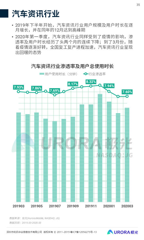 受疫情影响,汽车资讯行业在用户规模及用户时长方面结束了自2019年下半年以来的持续增长。报告显示,一季度前两月,汽车资讯行业渗透率及用户使用时长持续下降,3月份随着疫情得到控制,呈现回暖趋势。