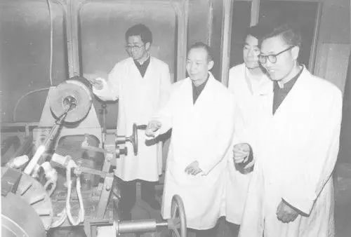 1977年在武汉邮科院赵梓森(左二)与同事讨论石英玻璃熔炼。