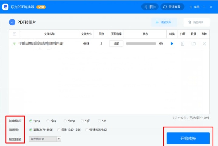 4、添加好文件后,选择输出格式、清晰度、输出目录,点击开始转换,等几秒钟就能得到图片啦。