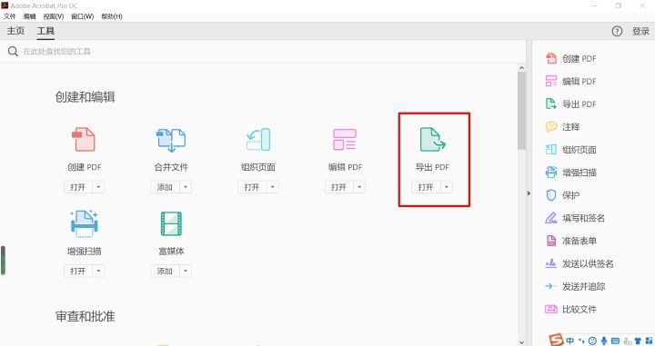 1、打开Adobe Acrobat DC,点击右上角的工具,点击导出PDF。