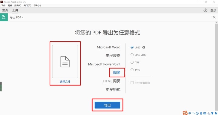 2、点击选择文件,设置PDF导出格式为图像,点击导出,就能保存所需图片了。