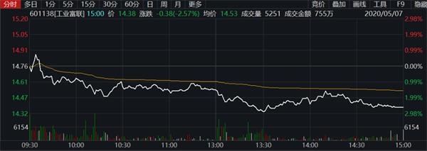 而富士康的主要上市主体工业富联,2019年实现营业收入4087亿,同比下降1.6%;实现净利润186.1亿,同比增长10.1%。2020年第一季度,实现营业收入800.54亿元,同比下降0.08%,实现净利润18.68亿元,同比下降35.01%。公司股价3月份进入了下跌模式,从年初最高21元/股,到12.42元/股,下降超四成。截至5月7日收盘,工业富联报收14.38元/股,总市值2855亿。