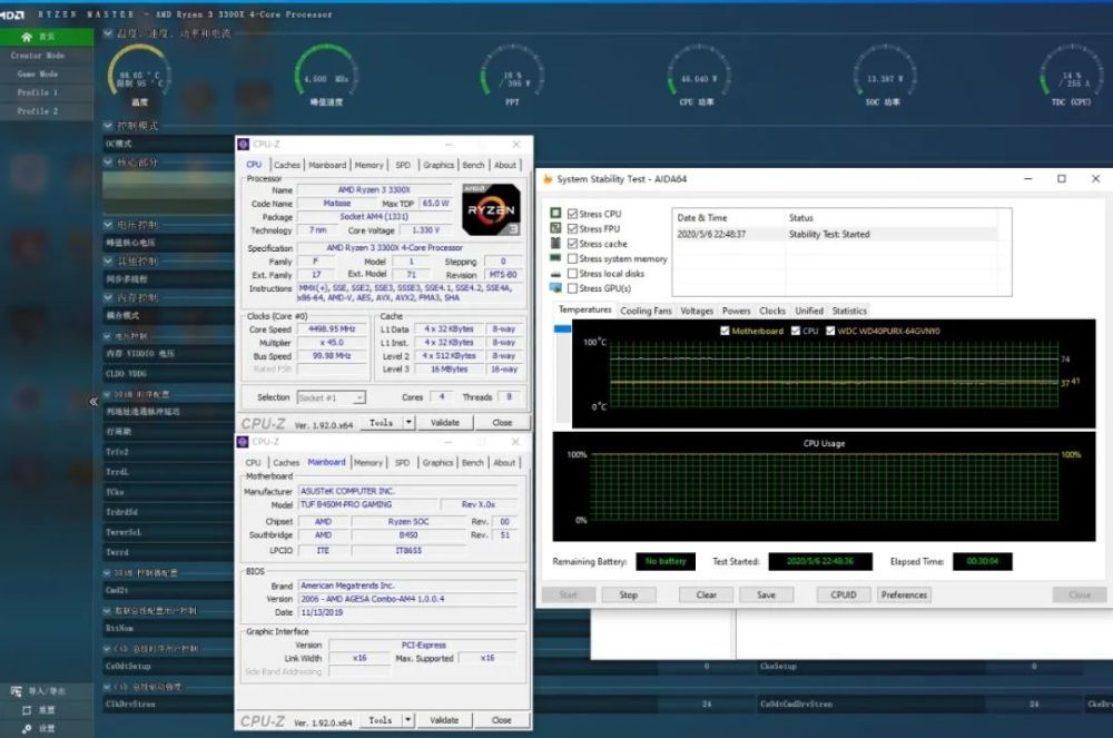 ▲锐龙3 3300X也可稳定超频到4.5GHz,并通过同时开启CPU、FPU、CACHE的AIDA64半小时烤机测试,只是所需电压达到1.33V,发热量会高一些。