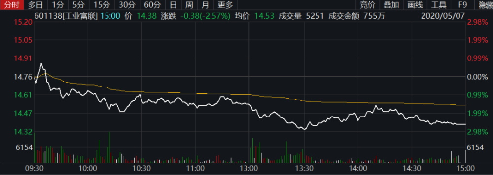 而富士康的主要上市主体工业富联,2019年实现营业收入4087亿,同比下降1.6%;实现净利润186.1亿,同比增长10.1%。2020年第一季度,实现营业收入800.54亿元,同比下降0.08%,实现净利润18.68亿元,同比下降35.01%。公司股价3月份进入了下跌模式,从年初最高21元/股,到12.42元/股,下降超四成。截至5月7日收盘,工业富联报收14.38元/股,总市值2855亿。