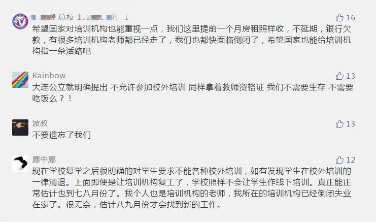 正如专家所说:培训机构也是学校,各地应该参照中小学校开学复课的要求,让培训机构在做好疫情防护措施和安全保障的前提下与同年级学历学校同步开学复课。