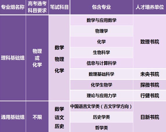 其中,基础理科学术类专业包括:数学与应用数学、物理学、化学、生物科学、信息与计算科学,旨在选拔并培养在基础理科领域有突出特长且有志于从事相关基础研究的学生。