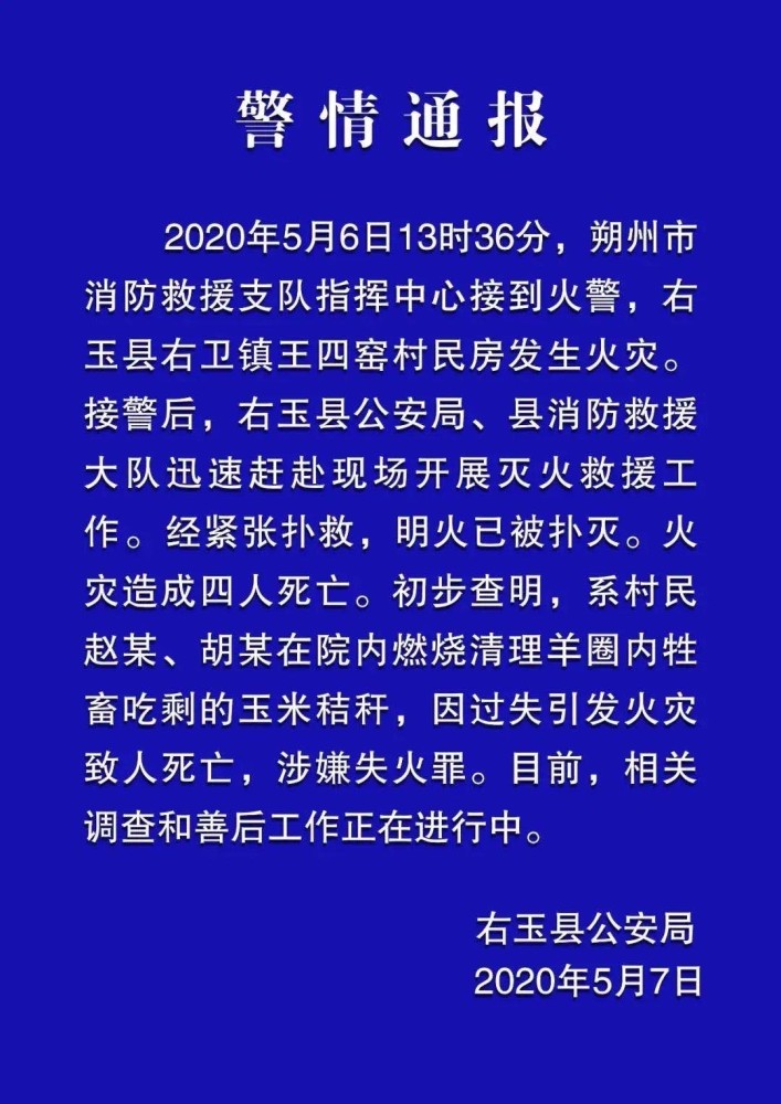5月7日,山西朔州公安局微信公众号发布通报称,5月6日13时36分,朔州市消防救援支队指挥中心接到火警,右玉县右卫镇王四窑村民房发生火灾。接警后,右玉县公安局、县消防救援大队迅速赶赴现场开展灭火救援工作。经紧张扑救,明火已被扑灭。火灾造成四人死亡。初步查明,系村民赵某、胡某在院内燃烧清理羊圈内牲畜吃剩的玉米秸秆,因过失引发火灾致人死亡,涉嫌失火罪。目前,相关调查和善后工作正在进行中。