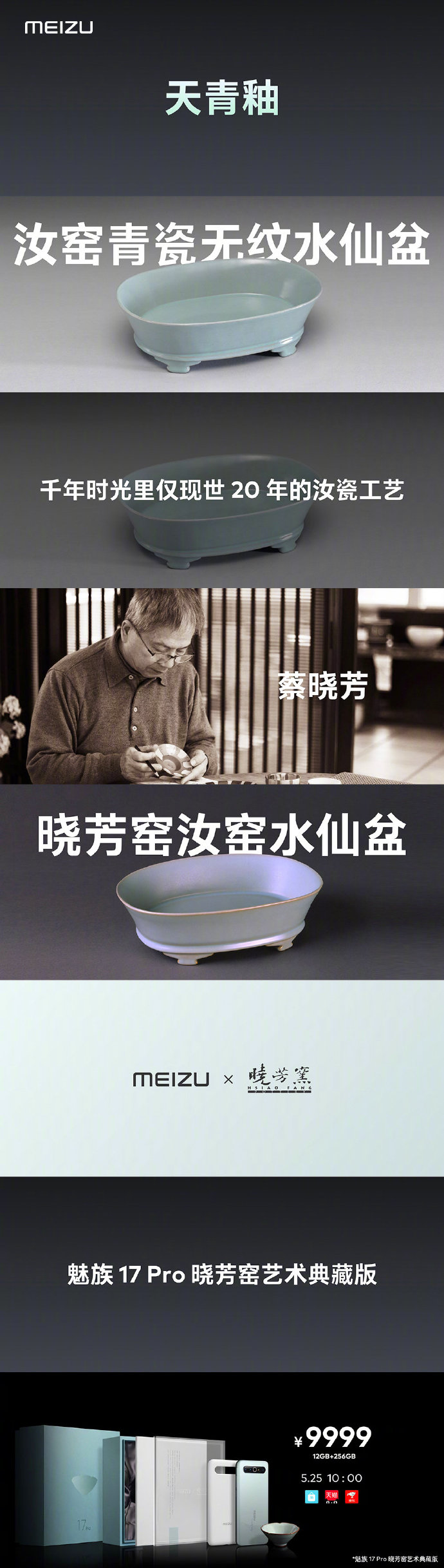 此外,魅族还带来了一款魅族 17 Pro 晓芳窑艺术典藏版,魅族与晓芳窑联合设计重现了『天青』。典藏版中,手机正面为白,背有主理人蔡晓芳的签名,同时附赠一个晓芳窑汝窑葵口盏杯。该典藏版 12 + 256GB 售价 9999 元,5 月 25 日 10:00 开售。
