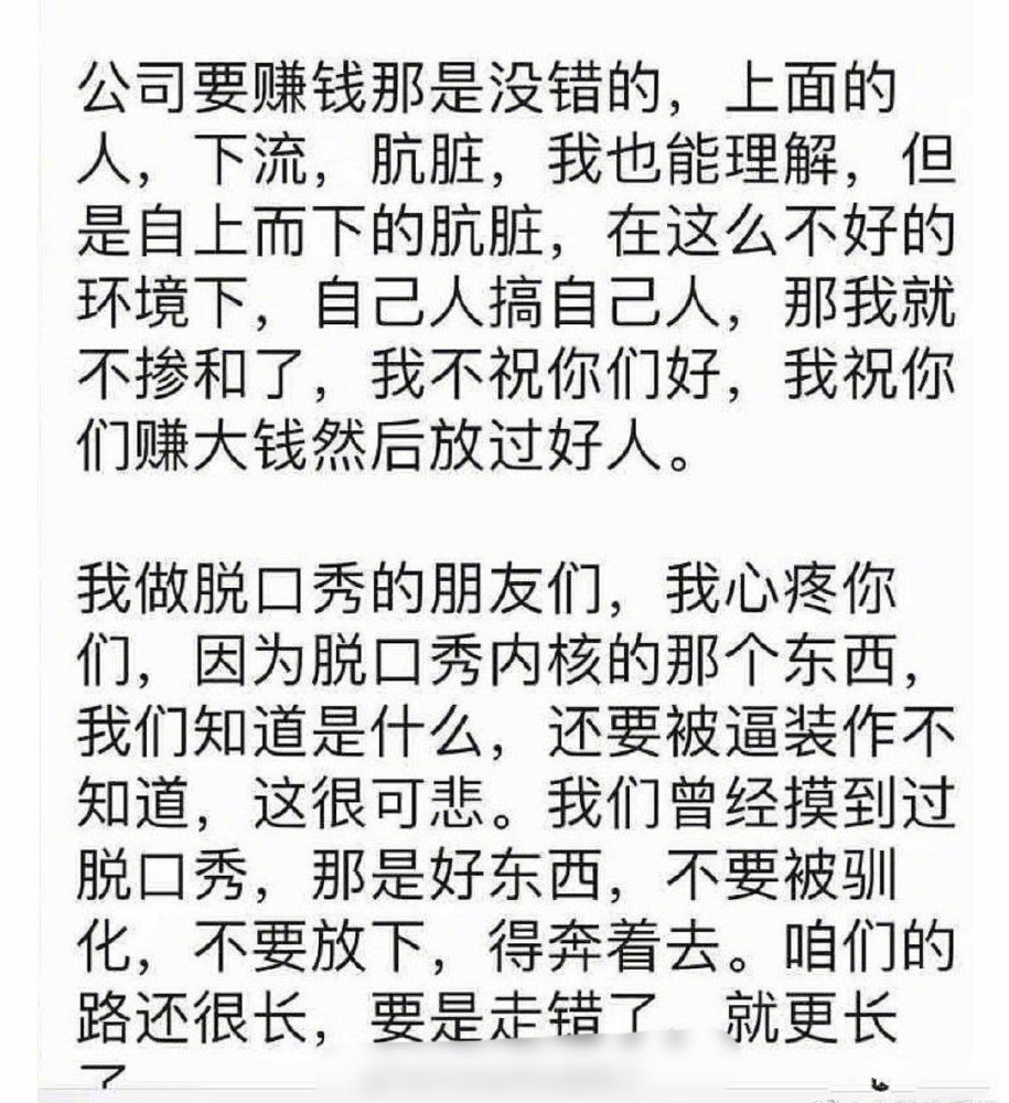 而在脱口秀届,笑果文化确实像是一家独大的公司,所以对于池子来说,解约也就基本意味着失去在脱口秀行业生存的基础。或许解约后的池子就只能走上自甘堕落的旅程,成为脱口秀届被抛弃的人,当然也不难看出池子认为脱口秀是有内核的,认为如今的公司和不少脱口秀艺人已经失去了内核。
