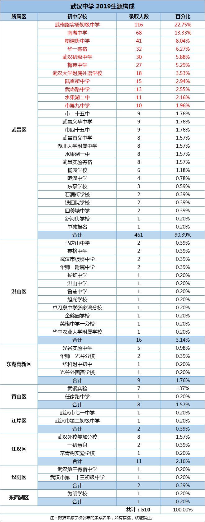 家长100小编解读:其中武珞路实验中学(23.72%)、南湖中学(13.14%)、粮道街中学(7.84%)、武汉初中(6.47%)人数占比超过50%,是武汉中学最主要的生源。