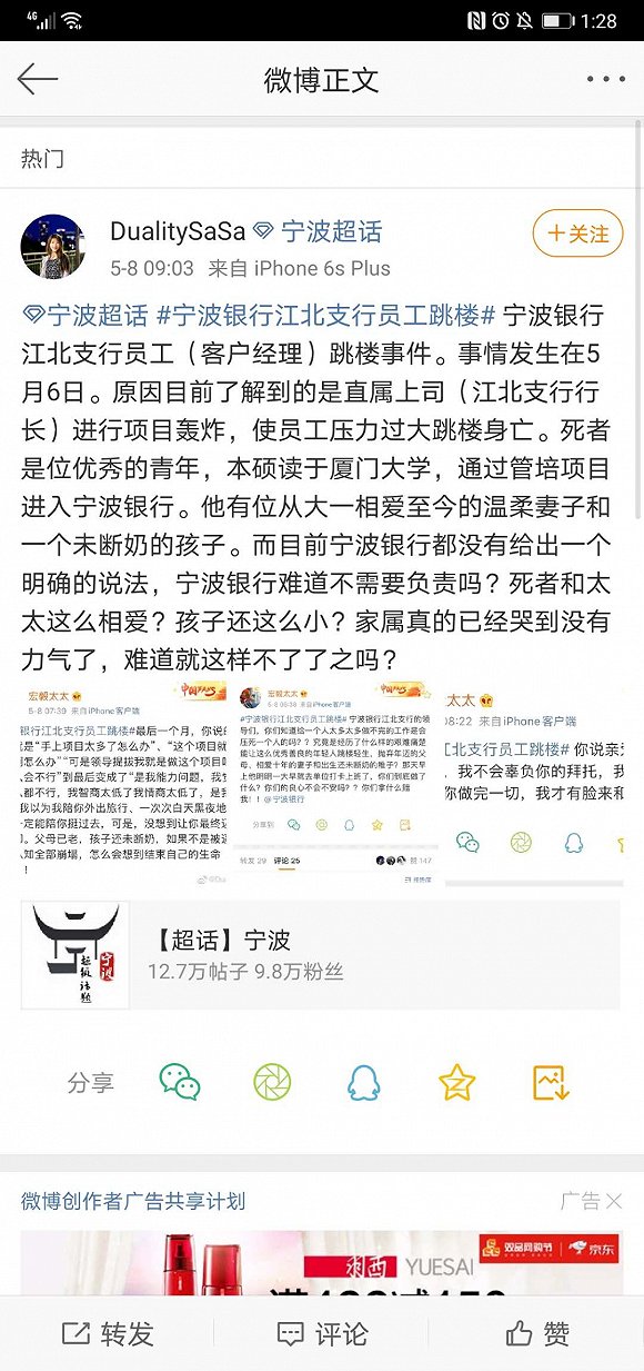 5月8日,网传宁波银行江北支行的一名员工因压力过大跳楼,疑为当事人爱人的微博用户“宏毅太太”就此事连发多条微博。