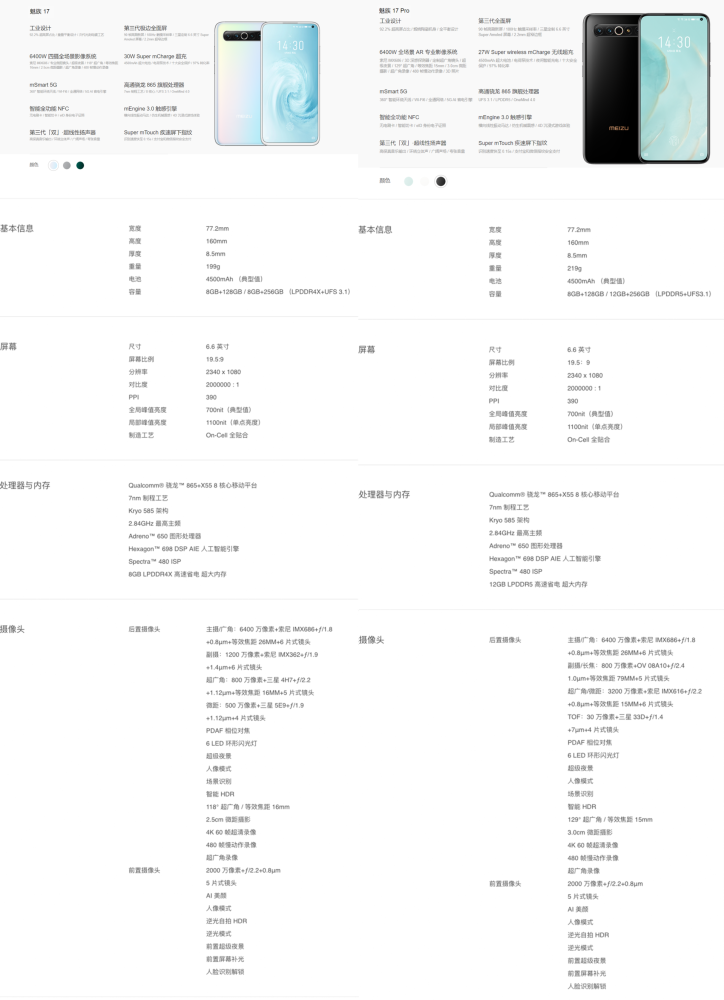除了标准版魅族17,魅族这次还推出了魅族17 Pro,魅族17 Pro和标准版在工硬件配置、相机、工业设计方面都有不少区别。