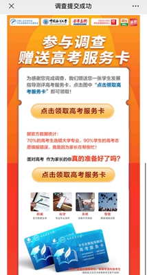 填写调查问卷后可免费获得高考服务卡,帮孩子做对高考决策,得到更科学系统的工作指导,帮助孩子赢跑高考!