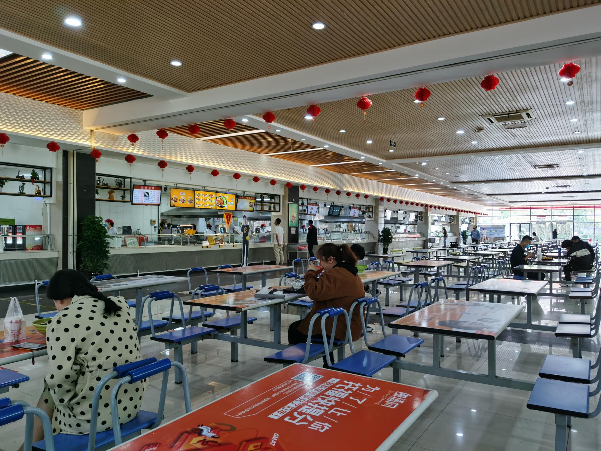 首日开放的25个窗口涵盖了标准套餐和风味套餐,米饭菜、麻辣烫、刀削面、重庆小面等应有尽有。炒菜里鸡蛋和肉类等高蛋白食物增加了供应量,助力同学们提高免疫力。大家一人一桌享用美味,不时抬头看看电子屏上滚动播放的防疫知识宣传视频。
