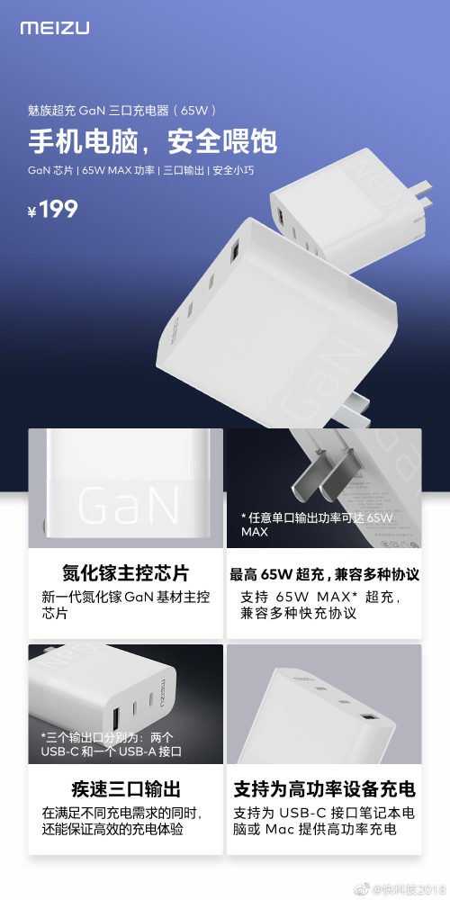 魅族超充GaN三口充电器采用新一代氮化镓GaN基材主控芯片,拥有两个USB-C和一个USB-A接口,支持多种充电协议。每个接口单独使用输出功率都可以达到最高65W。 售价199元。