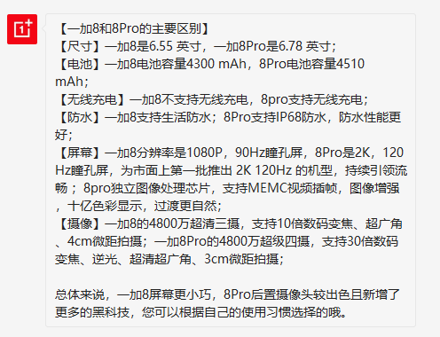 关于一加 8 标准版和 Pro 版的区别,我去找客服总结了一下,你们可以看看: