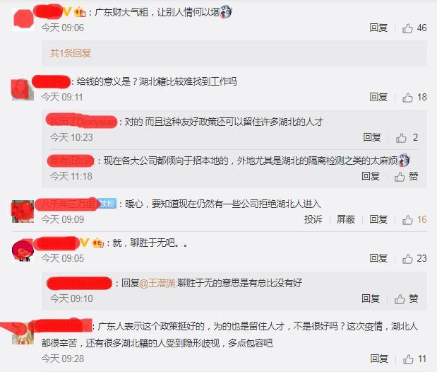 一部分网友认为广东实在是财大气粗,让其他省份情何以堪,也有的表示广东这个做法真的很暖心了,表现出了友好的包容政策,也能留下很多湖北的人才。