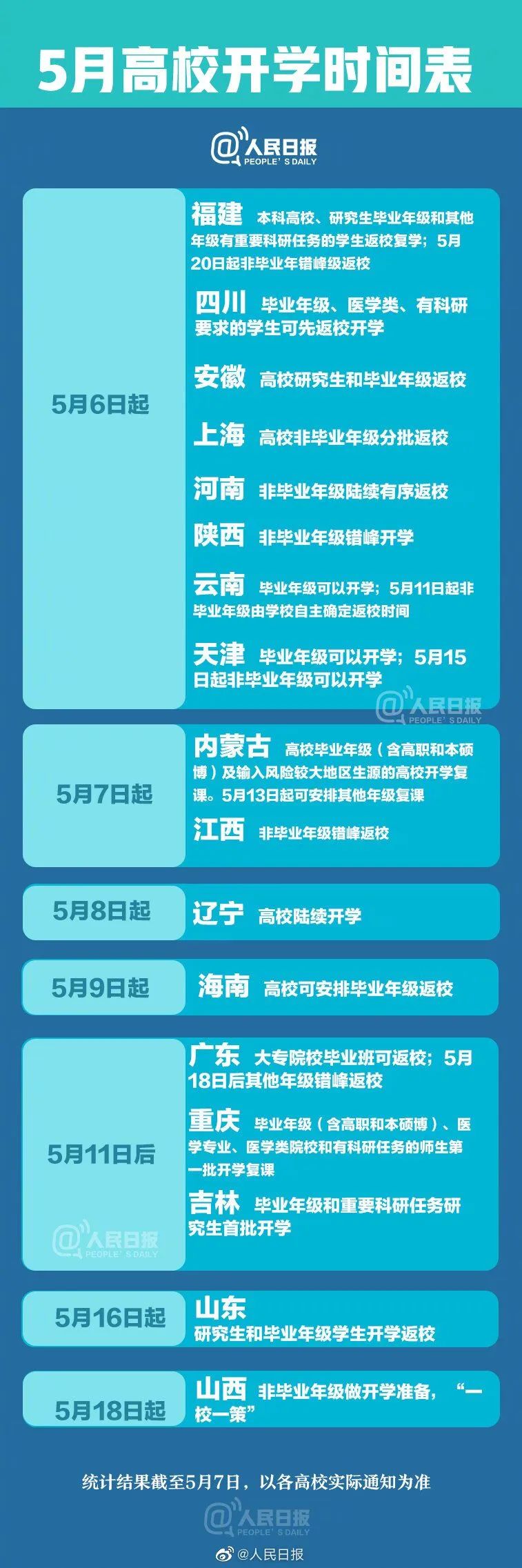 通知还指出,5月11日初二、高二年级学生返校复课;5月18日初一、高一年级学生返校复课;小学各年级学生、幼儿园幼儿返校(园)复课时间和校外培训机构开展线下培训时间根据疫情防控形势另行确定。