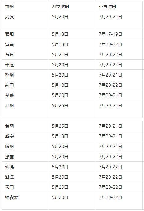 黄冈市、鄂州市初三年级开学时间分别为5月25日、5月20日,中考时间均为7月20日至21日。