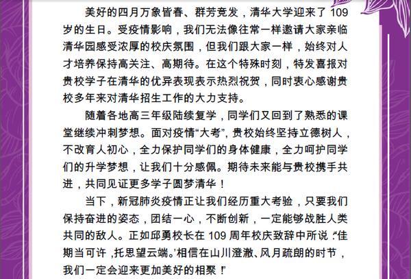 大河网讯 (记者 张楠)4月24日,记者从清华大学获悉,近日多所迎来高三复课的省内中学收到了一份特殊的礼物――来自清华大学的一封喜报。在备考关键时期,清华大学统计了河南籍清华本科生的2019年度评优评奖数据,向他们的高中母校发来喜报,并勉励广大高三学子保持奋进姿态、继续冲刺梦想,一起见证更多中原英才圆梦清华。