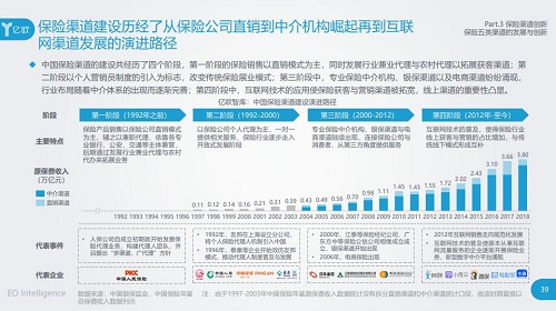 报告中,亿欧智库将中国保险渠道创新分为四个阶段:1992年之前,中国市场的保险产品销售以保险公司直销为主,辅以兼职代理;在1992年至2000年,国内保险市场逐渐引入了保险公司个人代理,并通过一对一的模式来向客户提供保险相关服务;2000年-2012年期间,专业保险中介机构、银保渠道与电商渠道陆续出现,第三方角度能够为用户提供更加可靠的保险服务;而自2012年至今,互联网保险销售正逐渐在整个保险行业中拥有更大的话语权,而轻松筹轻松保便是互联网保险梯队中最具代表性的企业之一。