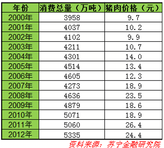 从表中可以看出,猪肉消费量一直稳步增长,价格也是螺旋形上涨,两者一结合,销售额增幅就更高。