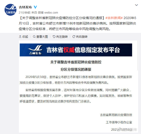昨日(9日),吉林省新冠肺炎疫情防控工作领导小组办公室发布通报,2020年5月8日,吉林省公布1例本地新冠肺炎确诊病例。