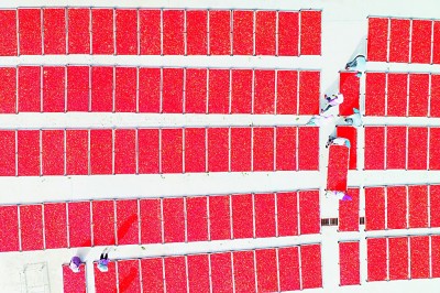 红寺堡区红寺堡镇光彩村村民晾晒枸杞。丁半农摄
