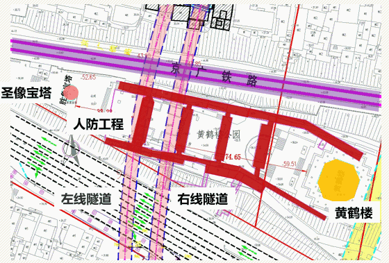 5号线施工风险高,隧道设计拱顶高度与京广铁路、蛇山防空洞、“武汉名片”黄鹤楼和元代“圣像宝塔”距离分别为26米、4.2米、86.9米和50米。爆炸产生的冲击波振动,成为施工关键重难点。