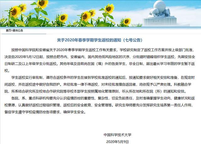 通知指出:按照中国科学院和安徽省关于2020年春季学期学生返校工作有关要求,学校研究制定了返校工作方案并报上级部门批准,决定自2020年5月12日起,按照合肥市内、安徽省内、国内其他低风险地区的次序,分批错时错峰组织学生返校,先期安排全日制研二及以上年级学生分批返校。其他年级及目前尚在国(境)外的各类学生,非全日制、超出最长学习年限的学生暂不返校。
