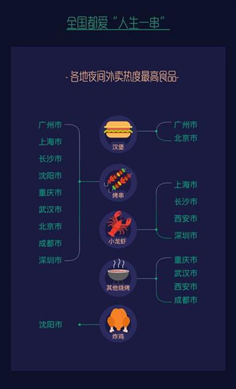 烤串成为多个城市美团用户最爱的夜间外卖。面包甜点、小龙虾、火锅、奶茶等其他宵夜品类也有明显增长,折算成等价食物,约等于北京人民吃掉33万串烤串,武汉人民吃掉22万串烤串,上海人民吃了24万只小龙虾,“逛吃逛吃”成为夜晚首选。
