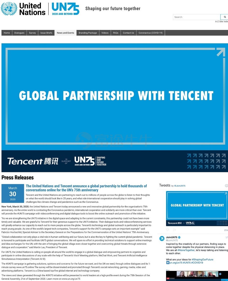 美东时间3月30日,联合国在纽约总部宣布,腾讯公司成为其全球合作伙伴,为联合国成立75周年提供全面技术方案,并将通过腾讯会议、企业微信和腾讯同传在线举办数千场会议活动。这意味着,在新冠病毒疫情之下,迄今为止规模最大的全球对话将在中国互联网科技企业的技术支持下进行。联合国发布官方新闻称,「这是一项全新且创新的全球合作」。