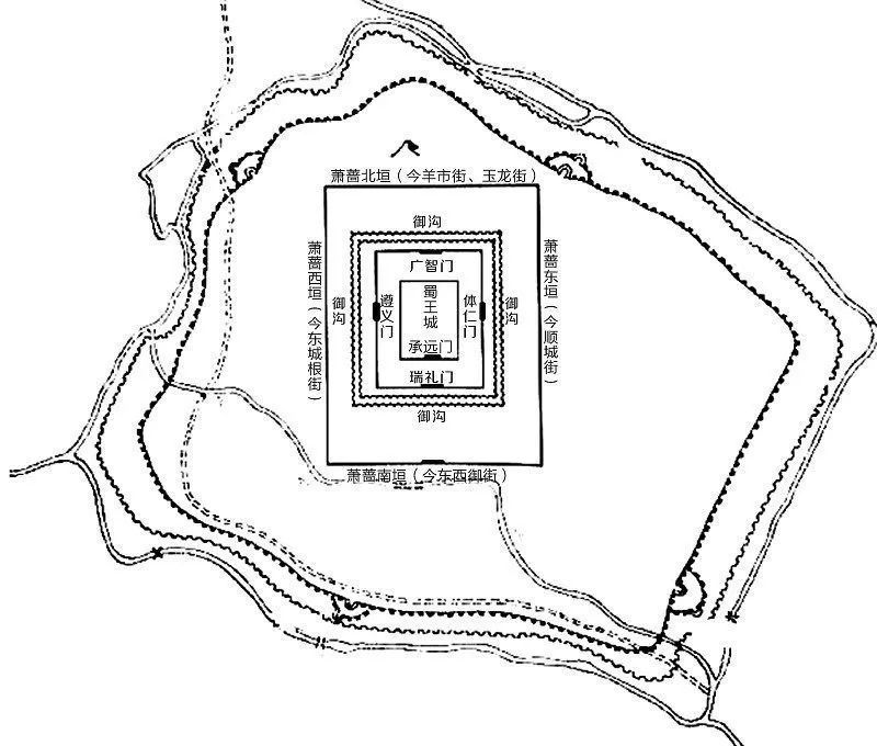 蜀王府,始建于明朝洪武十五年(1382年),位于今成都天府广场一带,是明代最富丽的藩王府之一,以南京故宫为蓝本,缩小规制而建。1644年,张献忠率农民军攻入成都,蜀末王朱至澍跳井而死。张献忠在蜀王府自称大西王,并以蜀王府为西王府,1646年,张献忠在撤离成都前焚烧了蜀王府,蜀王府部分建筑被烧毁。