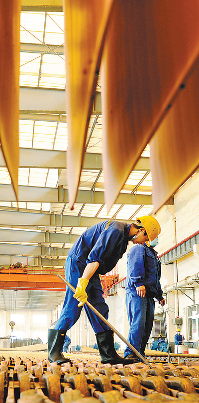 4月13日,江西上饶市横峰县经济开发区一环保科技企业,员工提炼萃取的电解铜。