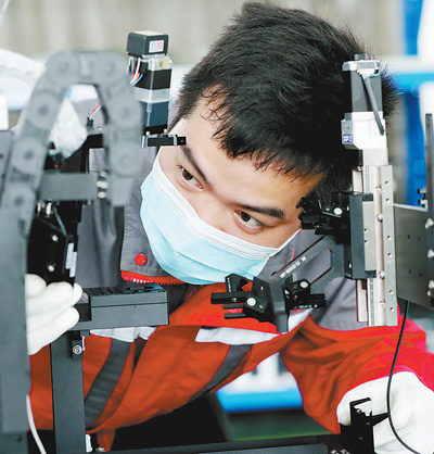 5月1日,江苏苏州一家自动化技术公司员工调试光路自动组装机。