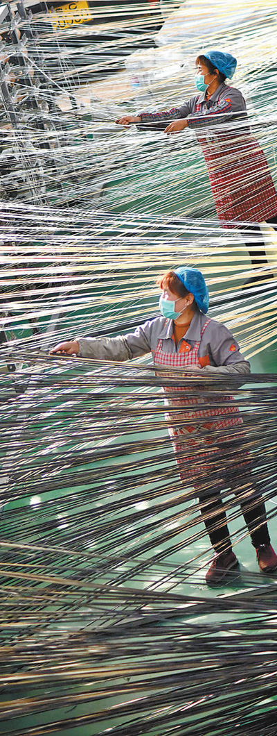 山东淄博市沂源县鲁村镇一塑编企业,工人在生产线上劳作。