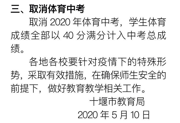 今天(5月10日),十堰市教育局发布重要通知,今年取消体育中考。