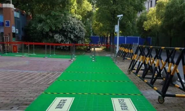 校门外,设两条进入通道,每隔1.5米,用交通标线提醒师生保持安全距离。校内各种标识清晰完整。