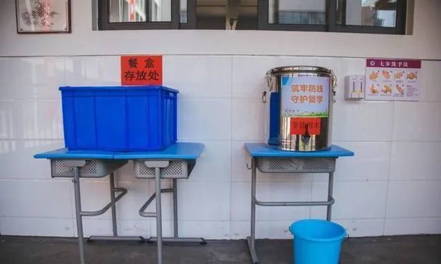 班上改变以前排队取餐的惯例,学生就餐前坐在自己的座位上,由当天值日生分发餐食。吃完后,餐盒由食堂工作人员收走,尽量减少学生聚集的可能性。