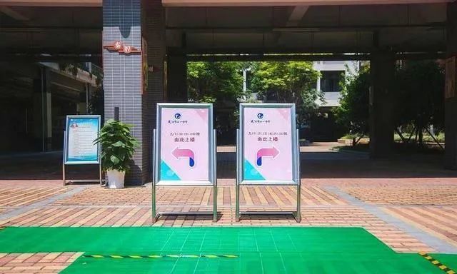 校门内,通向教学楼的走道旁,摆放抗疫科普知识及学校疫情防控应急处置流程图等内容的展板,正对大门的办公楼外墙垂挂巨幅标语,户外电子大屏滚动播放校园防疫宣传片。在通往教室的楼道、走廊和教室内,摆放绿植。
