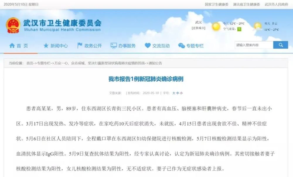 患者高某某,男,89岁,住东西湖区长青街三民小区。患者有高血压、脑梗塞和肝囊肿病史,春节后一直未出小区。3月17日出现发热、发冷等症状,在家吃药10天后症状消失,未就医,4月15日患者出现食欲不佳、精神不佳症状。5月6日在社区人员陪同下,全程戴口罩在东西湖区妇幼保健院进行核酸检测,5月7日核酸检测结果显示为阳性,血清抗体显示IgG阳性。5月9日复查抗体结果为阳性,经专家认真讨论,认定为新冠肺炎确诊病例。其密切接触者妻子核酸检测结果为阳性,女儿核酸检测结果为阴性,无不适症状。妻子已作为无症状感染者上报。