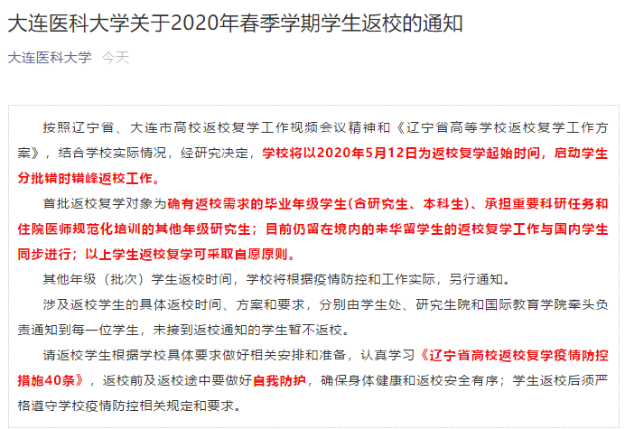 大连医科大学返校通知